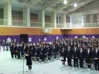 表彰伝達式、目録贈呈式終了後、同窓会入会式が行われました。始めに全校生徒で学生歌、応援歌を披露した後、同窓会入会式が行われました。入会式では同窓会会長の酒井様から歓迎の言葉と学校長からの祝辞があり、各クラスの幹事の紹介と代表による宣誓が行われました。1万2000人を超える同窓生の一員となる3年生の皆さん、これからも鶴来高校の発展のために力を貸してください!入会式後の全体終礼では、卒業式が同日のため明日の式に出席できない1年生の時の担任の先生と前の校長先生よりビデオメッセージをいただきました。懐かしい顔ぶれに喜んでいた卒業生でした。