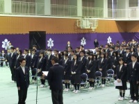 卒業式を明日に控え、午後から予行練習が行われた後、表彰伝達式と目録贈呈式が行われました。卒業する3年生に対し、スポ科や商業科の成績優秀者や各種功労賞、皆勤賞などの表彰が行われ、多くの卒業生が表彰を受けました。3年間の功績が認められた賞ばかりなので、頑張った自分への誇りとして受け取ってください。次に行われた目録贈呈式では、卒業生からジェットヒーターとプロジェクターが学校に送られ、在校生から卒業生へは印鑑セットが送られました。