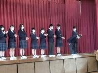 挨拶が少しずつ良くなっている生徒が増えているので、さらに質を高めていってほしいといった話など、在校生に向けての激励の言葉が送られました。その後、全校生徒でマスク越しに校歌と応援歌を歌いあげました。