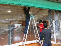 今日は部活動の終わりに、白山郷武道館弓道場にビニールの幕を取り付けました。