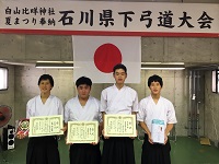 今大会は、4射×2回の計8射の合計的中で段位ごとに分けた部門別の個人戦で順位を決しました。石川県下の大会ということで大勢の選手が参加した中で本校の選手は大健闘しました。