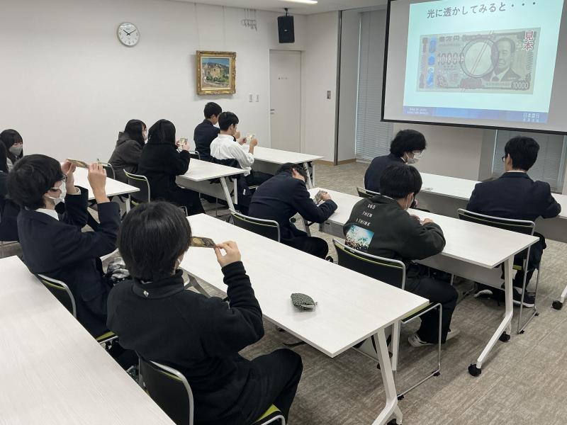 2023年に移転したばかりの新しい支店にて、まずは職員の方から日本銀行の3つの役割や仕事について、映像や講話を交えて詳しく解説していただきました。特殊ライトを使った「偽造防止技術」の確認では、普段何気なく使っているお札に隠された高度な技術に、多くの生徒が熱心に見入っていました。