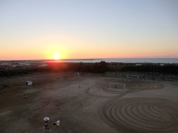 日中は青く広がる海を見ることができ、夕方は夕日が水平線に沈むようすを見ることができます