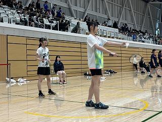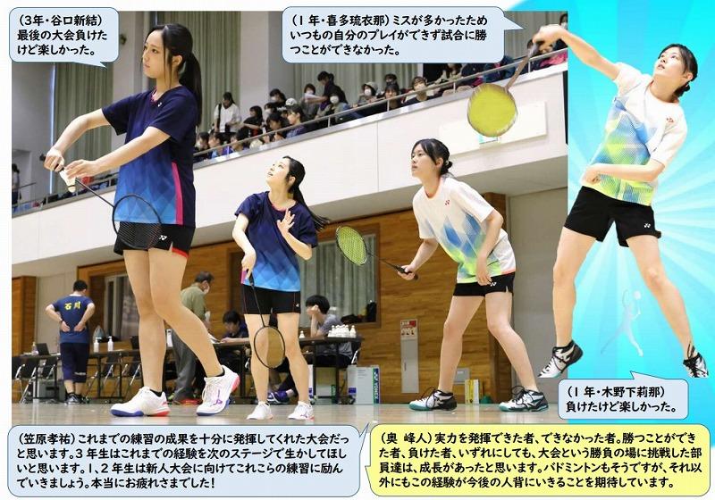 ・試合には負けてしまったが、自分に自信がついた気がした。試合では、自分の得意なカットやヘアピンなど、ネット前の調子が良かったが、簡単なミスが目立っていた。最後サーブミスで終わってしまったのが本当に悔しかった。そして、長期戦でもしっかり戦えるスタミナをつけられるよう、残りの総体までの練習を頑張りたい。