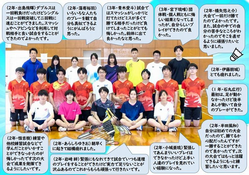 バドミントン部男子9名、女性4名が出場しました。男子では2年ぶりに団体戦にも出場しました。女子では22Hの渡辺涼花がベスト16に入り、健闘しました。