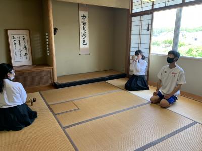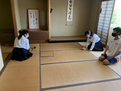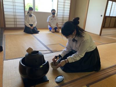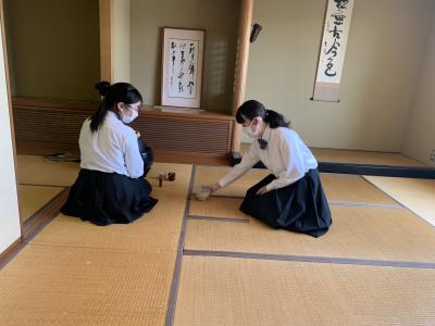 茶道部は3年生4名で活動しています。お稽古では、靴の揃え方から和室の入り方にはじまり、伝統や礼儀を重んじ相手を敬う心や四季折々の季節感を大切にし「もてなし」の心を基本にした生活文化を学ぶことはとても勉強になります。一服のお茶で心落ち着かせながら有意義な時間を楽しんでいます。茶道部 部長 水瀧彩奈 31H