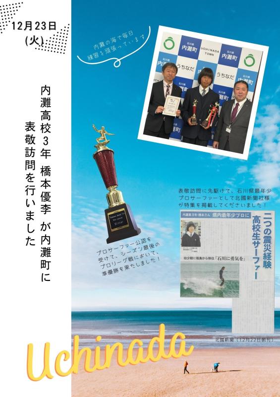 本校3年生の橋本優李さんが、練習拠点である内灘町を表敬訪問し、今年度のプロサーフィン選手としての活躍を報告しました。