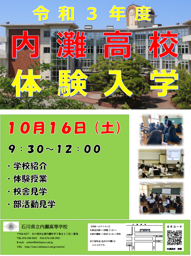 内灘高校「中学生の体験入学」のお知らせです。内灘高校で高校生活を1日体験してみよう!