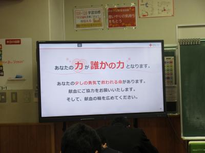 11/26(水)5限の3年1組の保健の授業に、県赤十字血液センターの勝田さんによる特別授業を行いました。勝田さんには、少しの勇気で誰かが救われることや、献血は最も身近なボランティアであること等、献血の意義などについて分かりやすく教えていただきました。全血献血(200mL)は16歳からできます。3年生にとってはもうすぐです。今日は貴重はお話をしていただきました。勝田さん、県赤十字の皆さま、ありがとうございました。