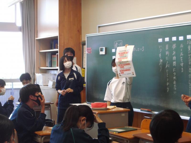 生徒会の時間では、6月のあいさつweekに意欲的に取り組んでいた学級を表彰しました。