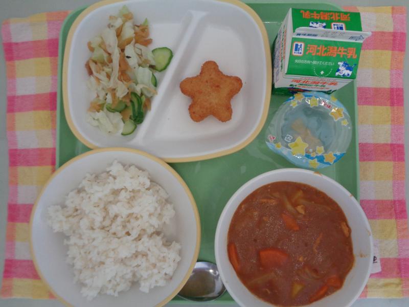 今日の給食は、チキンカレーライス、牛乳、星のコロッケ、福神漬け、七夕ゼリーの七夕献立でした。