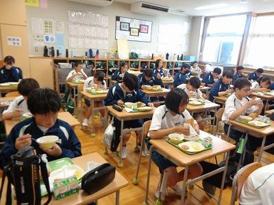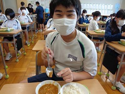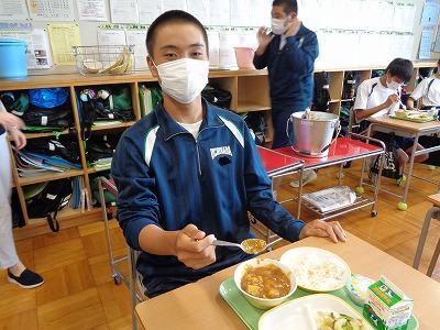 給食週間最終日の献立は、北海道から全国に広まったスープカレー、北海道で生産量の多いかぼちゃや乳製品を取り入れた北海道献立でした。普段とはちょっと違うカレーを、おいしそうに食べていました。