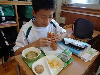 給食時間に1年生の教室をのぞくと、初めての「きなこ揚げパン」をおいしそうに頬張っていました。