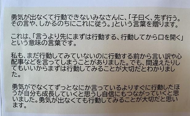・困っていることに対して、不満ばかりをぶつけるのじゃなくて、その不満をいいことに変えればいいと思った。部活動や学校生活での不満を、発案する力を使って解決していきたい。