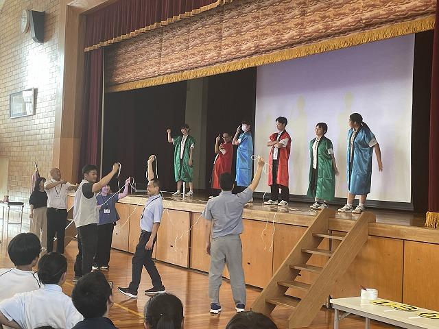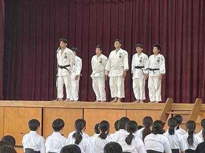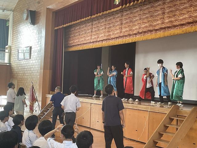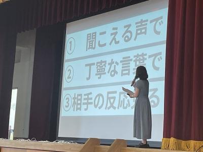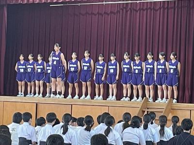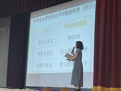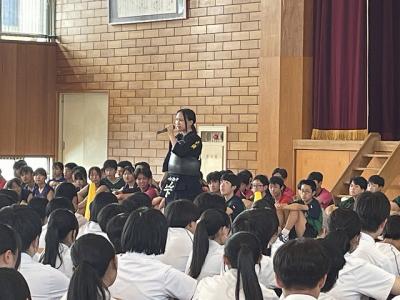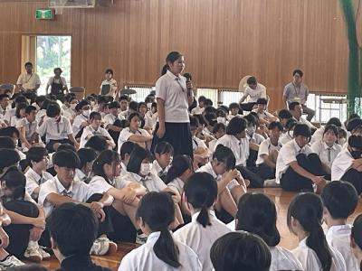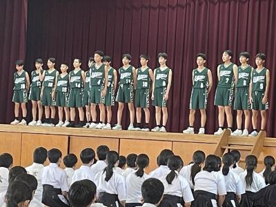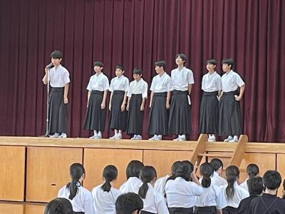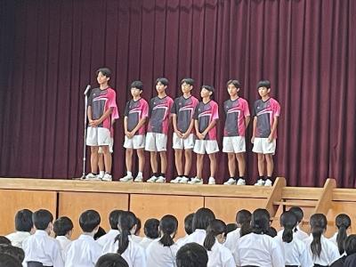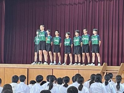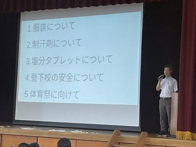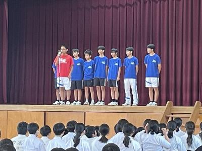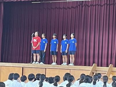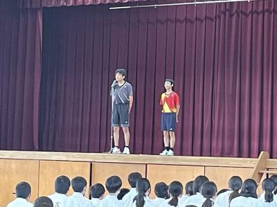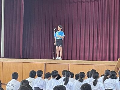 続いて校長講話では、目標に向けての努力をすること、自分に負けないことについて、学習担当からは家庭学習と授業レベルアップ習慣で取り組む「話すこと」について、生活指導担当からは校内外でのルールの確認についての話がありました。