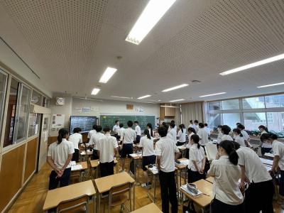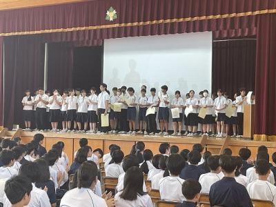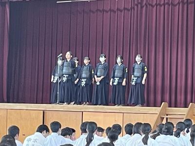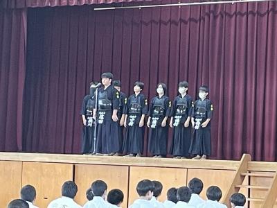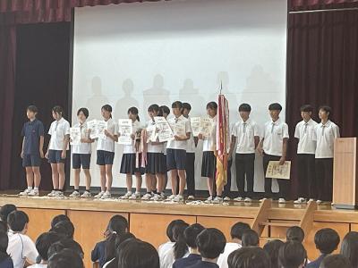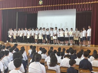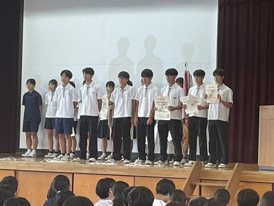 7/22(火)の4限目に1学期終業式をリモートで行いました。まず、県大会などの表彰伝達をおこないました。次に上位大会(北信越、全国)に出場する選手の激励を行いました。