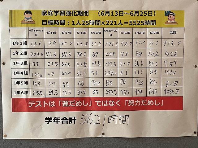 期末テスト前の6/13~6/25の期間に、1年生は家庭学習時間の目標を「1人25時間✕221人=5525時間」と定めて取組を行いました。結果は5621時間で、見事に目標を達成しました。よく頑張りました。これからも努力することを大切にして、成長してほしいと思います。