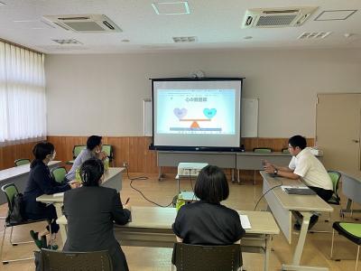 事故への対応は「起きないようにする方策」と、「万が一起きた場合の対応」の両方が必要です。本校では毎年、万が一に備えて教職員研修を行っています。8/6(木)の午後、内灘町消防署員の方々に講師をお願いし、AEDと胸骨圧迫による救命法等について学習しました。
