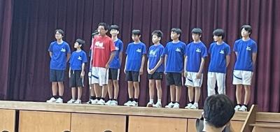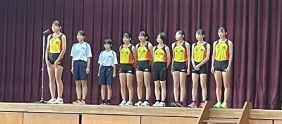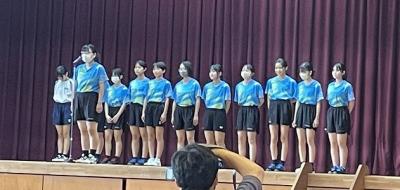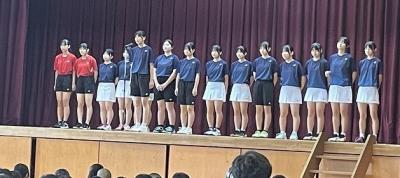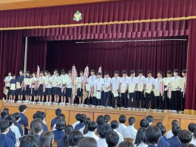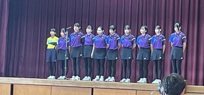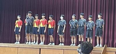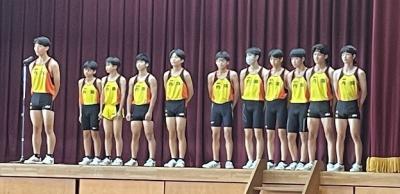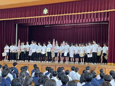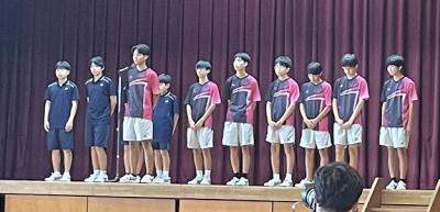 6/11(水)の午後、標記大会の壮行式が行われました。吹奏楽部の演奏のもと、各部のメンバーが元気よく入場しました。各部活動キャプテンの力強い抱負の後、選手代表の水泳部キャプテン:百萬さんは感謝の気持ちについて、生徒会長:清水さんは緊張を力に変えることについて話をしてくれました。内灘中メンバー全員の活躍を期待しています。