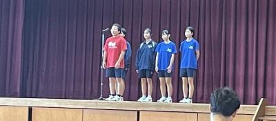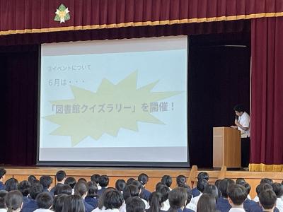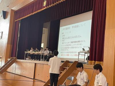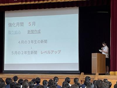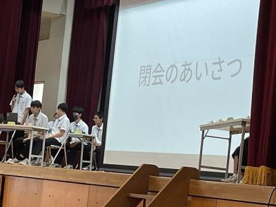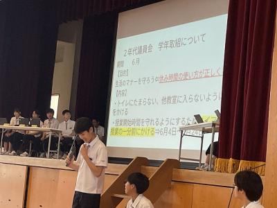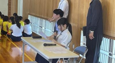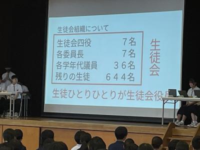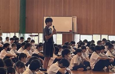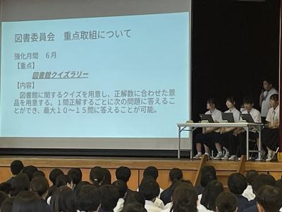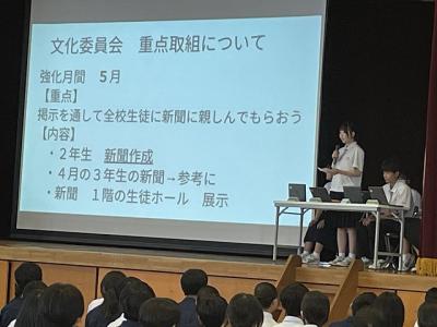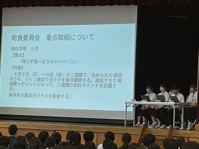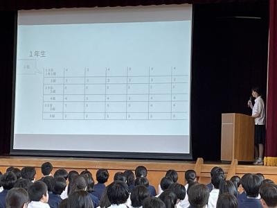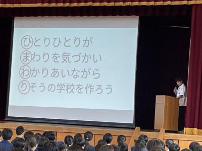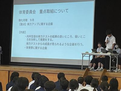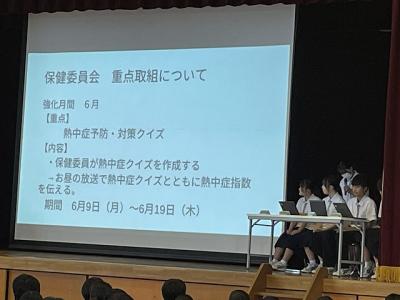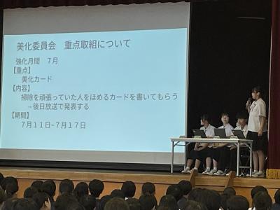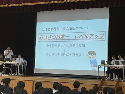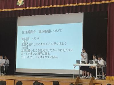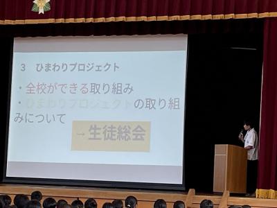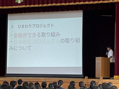 生徒会タイムでは専門委員会からの連絡や生徒会執行部による「あいさつウィーク」の振り返り、いじめ防止に向けた「ひまわりプロジェクト」についての説明がありました。