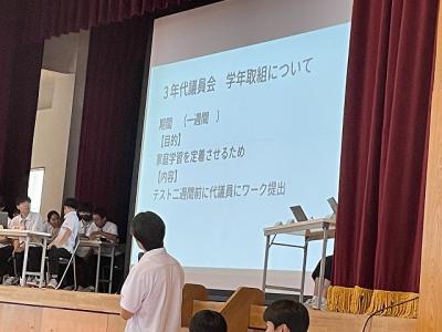 5/16(金)1限目、昨日までの修学旅行を振り返る学年集会を行いました。昨年度末から活動してくれていた修学旅行実行委員会のメンバーからは「修学旅行がゴールではない。今後、さらによい学年にステップアップできるように頑張ろう」という挨拶がありました。実行委員会の皆さんを労って、3年生全員で拍手をしました。