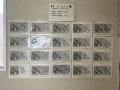 美術室前には、生徒たちの作品やワークシート等が掲示されています。