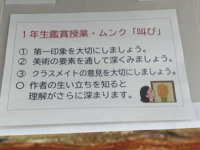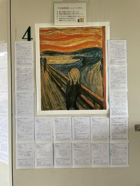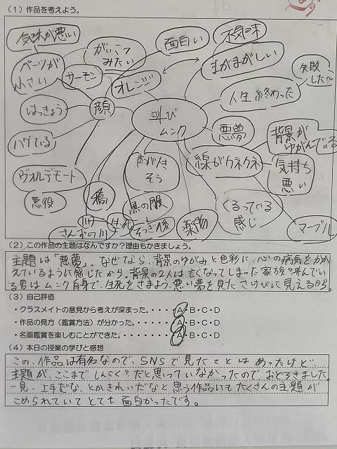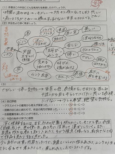 「1年生鑑賞授業・ムンク(叫び)」では、最初の印象を発表し合ったあと、作者の生い立ちを知ったり考えたことを学級で話し合ったりして、作品の主題に迫る授業でした。生徒たちは深く思考していることがわかります。