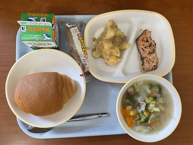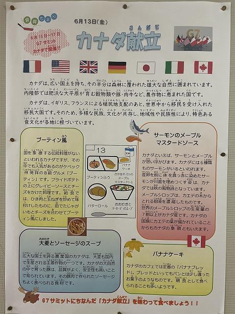 6/15~17まで、カナダ西部のカナナスキスでG7サミットがカナダで開催されます。これに因んで、今日の給食は「カナダ献立」です。メープルマスタードソースをかけたサーモンや、ケベック州発祥B級グルメ「プーティン」風のおかずに加え、カナダで定番のバナナケーキなど、とても美味しい給食でした。