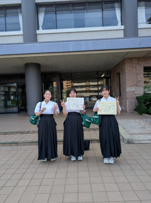 6/21(土)に行われた標記大会に、本校弓道部が出場しました。結果、女子団体3位に越中屋さん・前川さん・金子さんが、女子個人3位に越中屋さんが入賞しました。おめでとうございます。