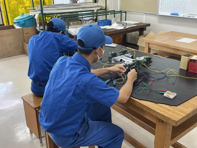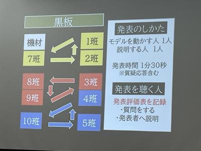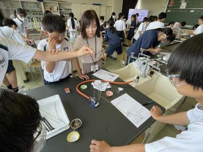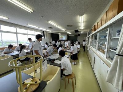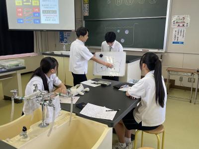 本校では、生徒の表現力の育成に取り組んでいます。この授業ではモデルを動かしながら、塩酸の電気分解の様子について説明をすることに取り組んでいました。