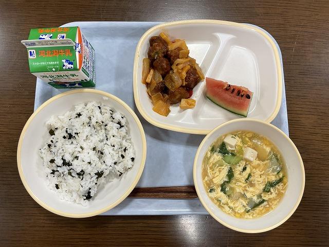 6/30(月)の給食に、わかめご飯、たまごスープとともに、スイカが出ました。今年初めてスイカを食べた生徒も多かったと思います。100玉近くの小玉スイカを、調理員さんたちが頑張ってカットしてくれたそうです。調理員の皆さま、ありがとうございました。とても美味しかったです。
