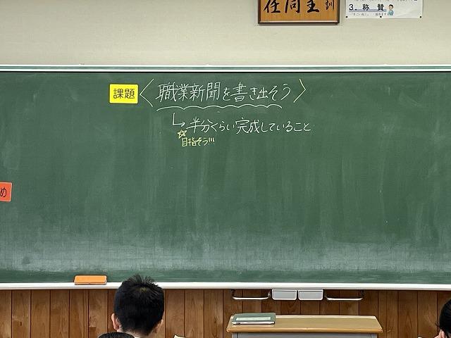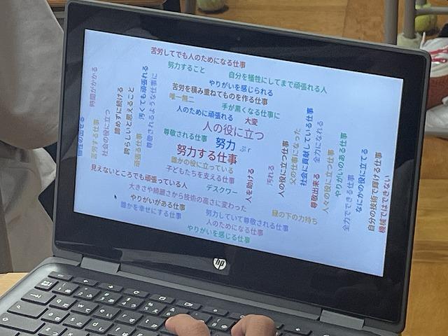 現在、1年生では進路学習の一つとして「職業調べ新聞」を作成しています。イラストレーターやベームクリエーター、図書館司書など、生徒たちはそれぞれ調べたい職業についてクロムブックを用いて作成しています。