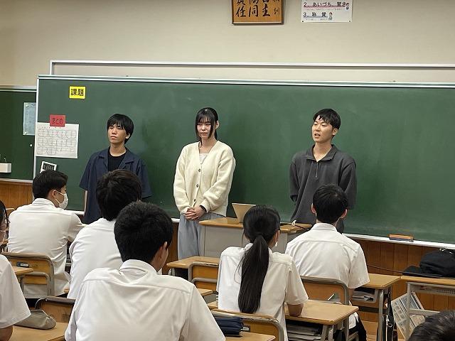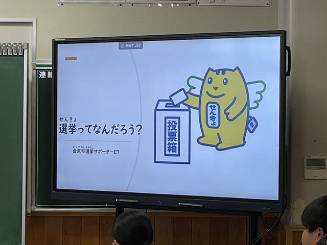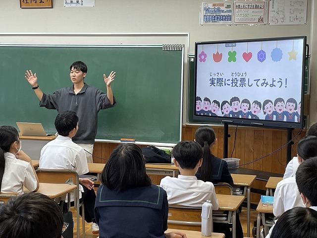 3年生では社会科で選挙制度について学習をしています。この日は金沢大学法学部から3名の大学生が来校し、特別に出前授業をしていただきました。3名の皆さんは「金沢市選挙サポーター E7」として投票を呼びかける活動を行っています。