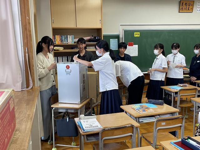 生徒たちは「政治とは?」「選挙とは?」などの質問について考えた後、模擬投票を行いました。投票箱は内灘町選挙管理委員会から貸していただきました。生徒たちは3年後に選挙権年齢になります。大学生の皆さんは「今回の授業が政治について考えるきっかけになれば」と話をしてくれました。