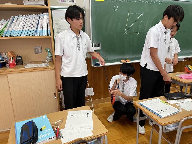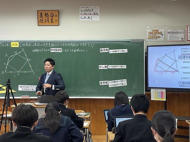 3年生の生徒たちはグループで話し合いながら、「中点連結定理」を使って課題の四角形が平行四辺形になることを証明していました。