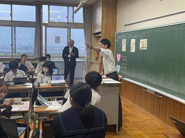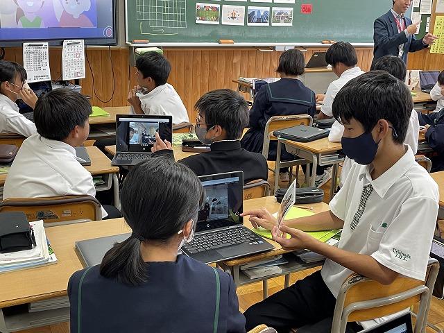 10/11(水)の午後、河北郡市内中学校の英語の先生方に来校いただき、1年生の英語の研究授業を行いました。生徒はそれぞれ家族やペットの写真を持ち寄り、写真の人物(動物)について互いに英語で質問をしていました。