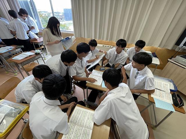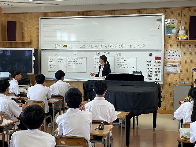 10/13(金)、県教育委員会の先生をお招きして3年生音楽科の研究授業を行いました。前回の授業で録音した自分たちの歌を聴き、パートごとに課題点を洗い出しました。生徒たちはどうすればもっと良い合唱になるのかを活発に話し合っていました。話し合いの最中に、自然に歌い出すパートもありました。