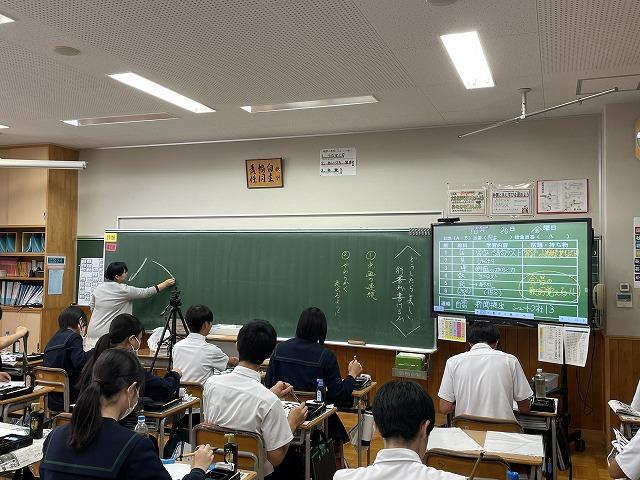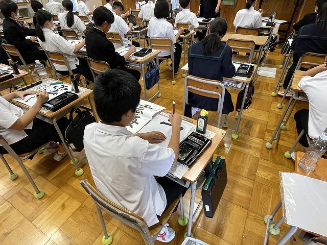 2年生の国語授業では書写が始まりました。2年生からは毛筆による行書に取り組みます。どの生徒も集中して真剣に取り組んでいました。
