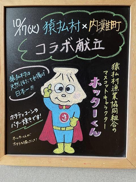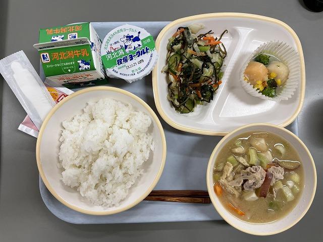 10/17(火)は猿払村から取り寄せた新鮮なホタテと内灘町のれんこんなどのコラボ給食です。