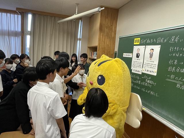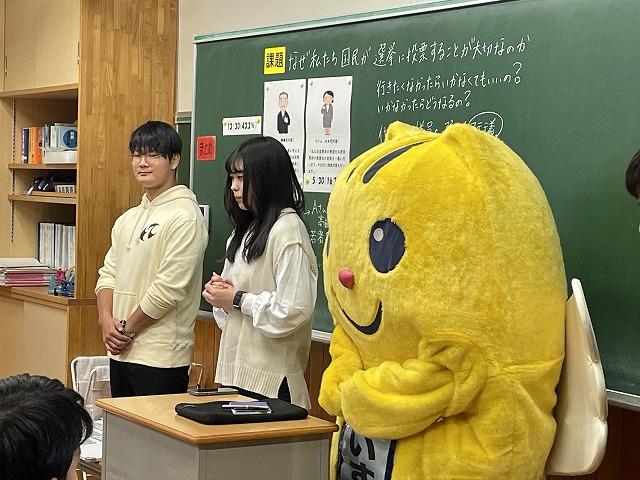 大学生の皆さんには、若者の投票率が低いことで日本の政治はどうなるのかについて分かりやすく教えていただきました。また、選挙や政治に関心をもつようになった理由についても語っていただきました。授業にはE7のマスコットキャラクターも登場しました。