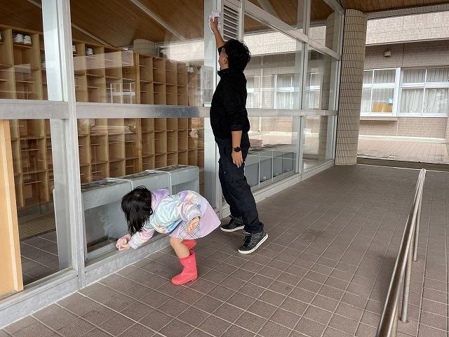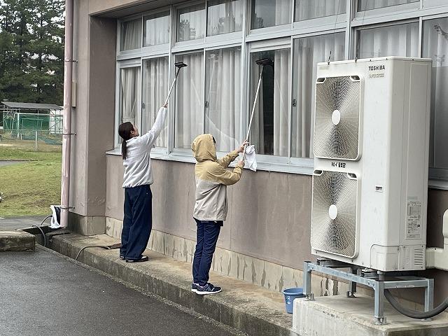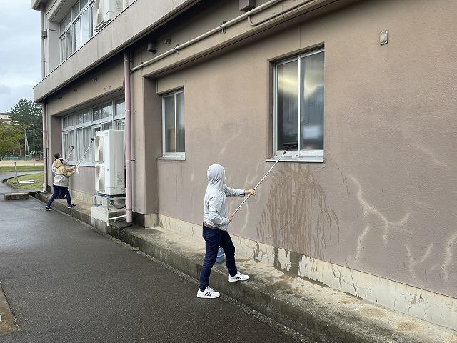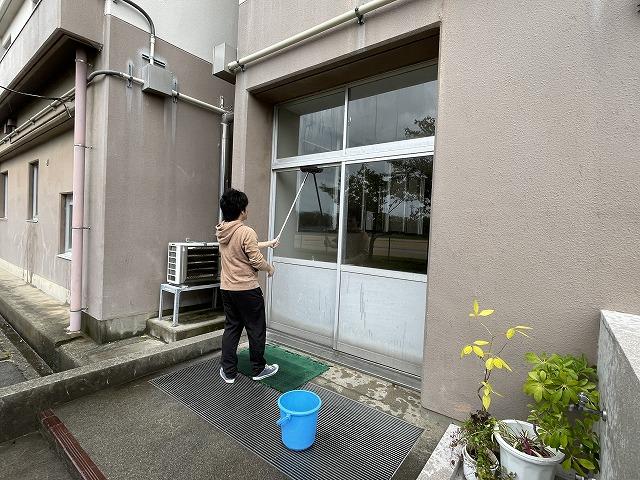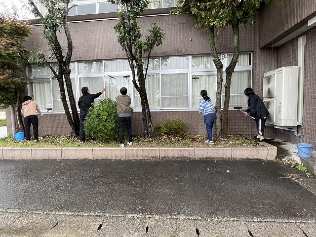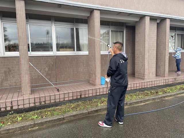 10/21(土)の午前9時から、PTA環境部の皆さまに校舎1階外側の窓拭きをしていただきました。ホースやバケツを使って窓ガラスに水をかけ、ワイパーで拭き取ったり、雑巾で窓枠拭いたりしていただきました。お陰さまでとってもきれいになりました。環境部の皆さまには前期にも窓拭きやグラウンドの草刈りをしていただきました。本当にありがとうございました。