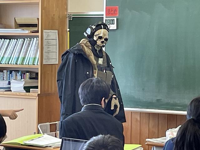 10/31はハロウィンで、今や全世界的にイベントが行われています。アメリカでは、ハロウィンの日は先生も生徒も仮装をする学校もあるそうです。ハロウィン前日の10/30(月)、本校ALTのベンジャミン先生が仮装をして授業に登場しました。全く予想をしていなかった生徒たちはとても驚いていました。(その後の授業については、生徒たちは切り替えて普段通りに学習していました。)