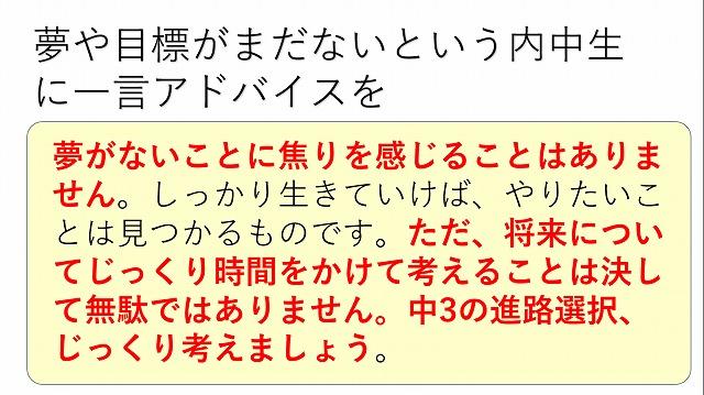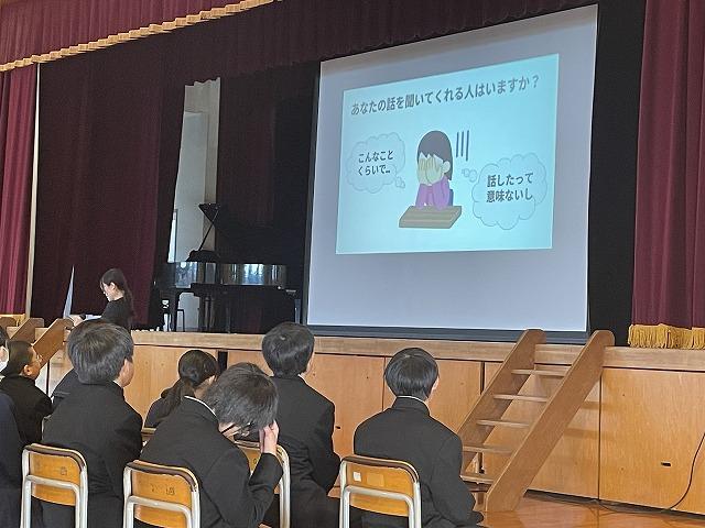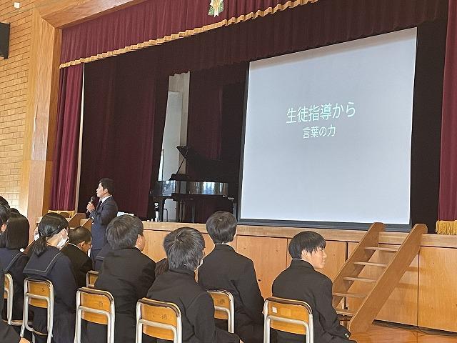 生徒指導からは「言葉の力」=互いに認め合うことや教育相談について、学習担当からは家庭学習の習慣化について話がありました。