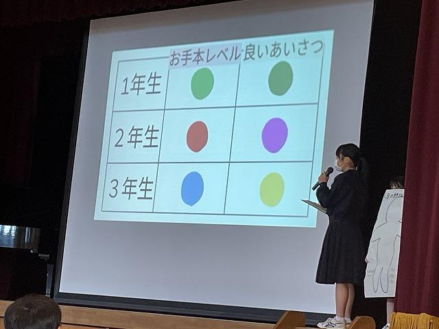 最後に生徒会執行部から、挨拶を充実させる取組についての紹介がありました。生徒会執行部は挨拶を充実させるため、楽しい企画を提案してくれました。生徒会執行部の皆さん、ありがとうございます。全校生徒の皆さん、ともに頑張りましょう。