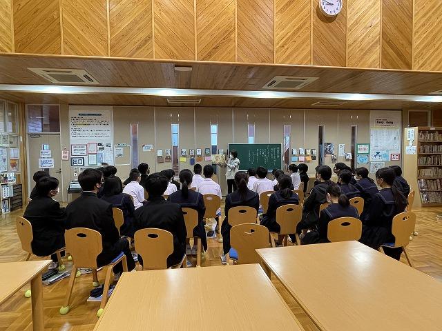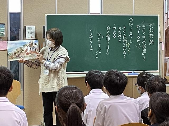 1年生国語科では、古典「蓬莱の玉の枝 竹取物語」について学び始めています。単元のはじめに、本校図書館司書の田辺先生による「かぐや姫」の読み聞かせを鑑賞した後、クイズに取り組んで内容の確認をしました。この後、「竹取物語」の学習を本格的に進めていきます。