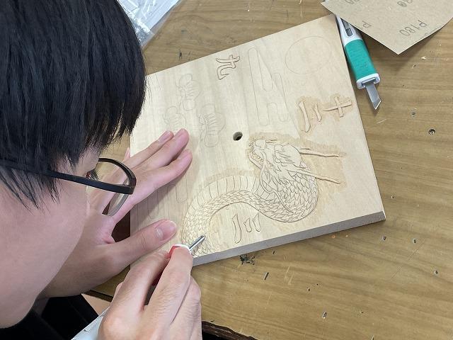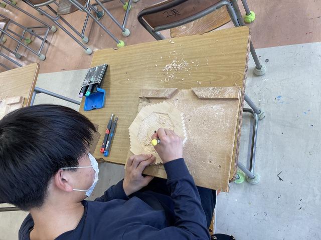 3年生美術科では木彫に取り組んでいます。生徒はそれぞれが自由に考えたデザインの文字盤をつくり、オリジナル時計の完成を目指しています。完成が楽しみです。