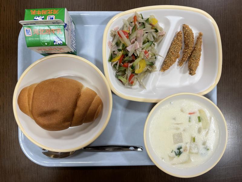 11/8(水)の給食は「いい歯の日」にちなんで、カルシウムたっぷりの「小魚(きびなご)のサクサク揚げ」やかみかみメニューの「カラフルごぼうサラダ」です。よく噛んで食べることは歯やあごを鍛えるだけではなく、むし歯予防にもなります。生徒の皆さんには、残さずにしっかりと食べてほしいと思います。