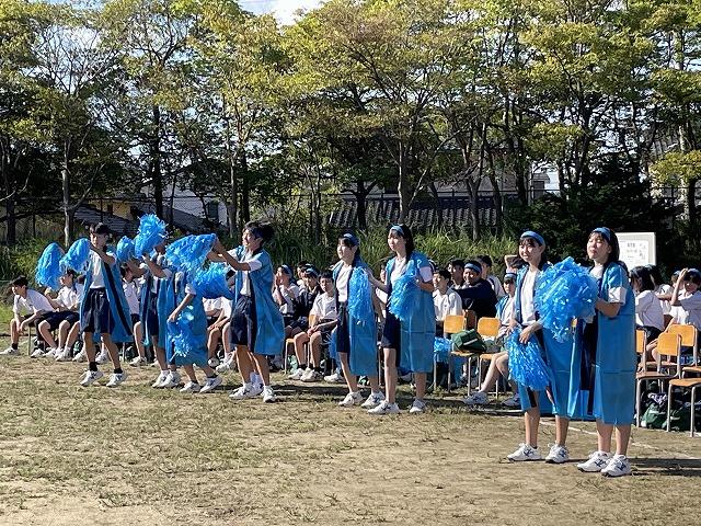 9/22(金)の午後、体育祭に向けて、全校生徒によるブロック練習が始まりました。生徒たちはそれぞれ4つの団に分かれ、3年生のリーダーシップのもと、応援合戦の練習に励んでいました。