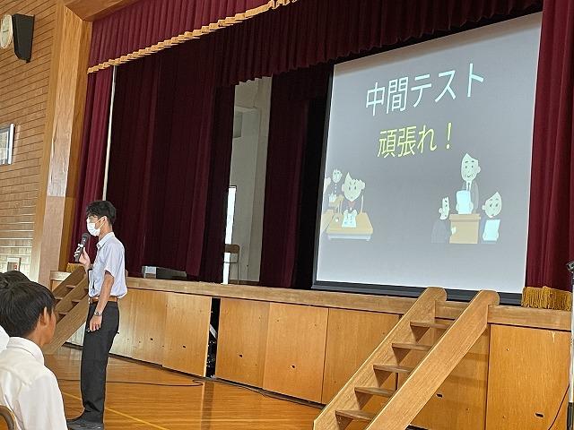 生徒会の時間では、前期生徒会執行部の頑張りを全校生徒による拍手でねぎらい、後期生徒会長が「生徒会をより身近に」と、力強く抱負を語ってくれました。後期も執行部の活躍が楽しみです。