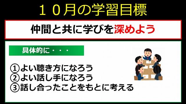 その後、校長からは自分を伸ばすために「素直に、丁寧に、何度でも、信じて感謝する」ことについて、学習担当からは9月の振り返りと10月の取組について、生徒指導担当からはスクールゾーンなどについて話がありました。